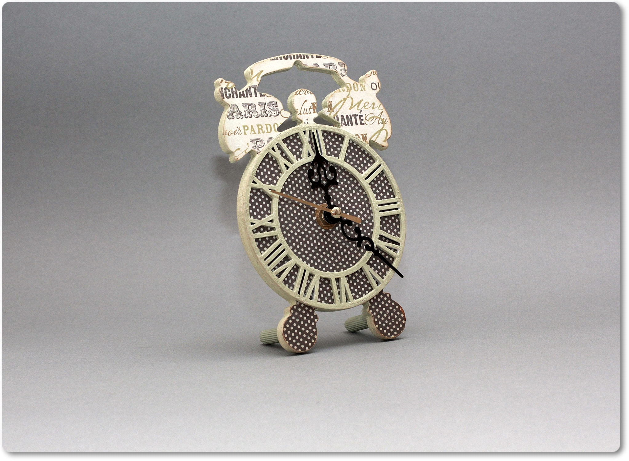 Материалы: Деревянная основа, бумага для скрапбукинга, кракелюрная и акриловые краски, акриловый лак, часовой механизм.