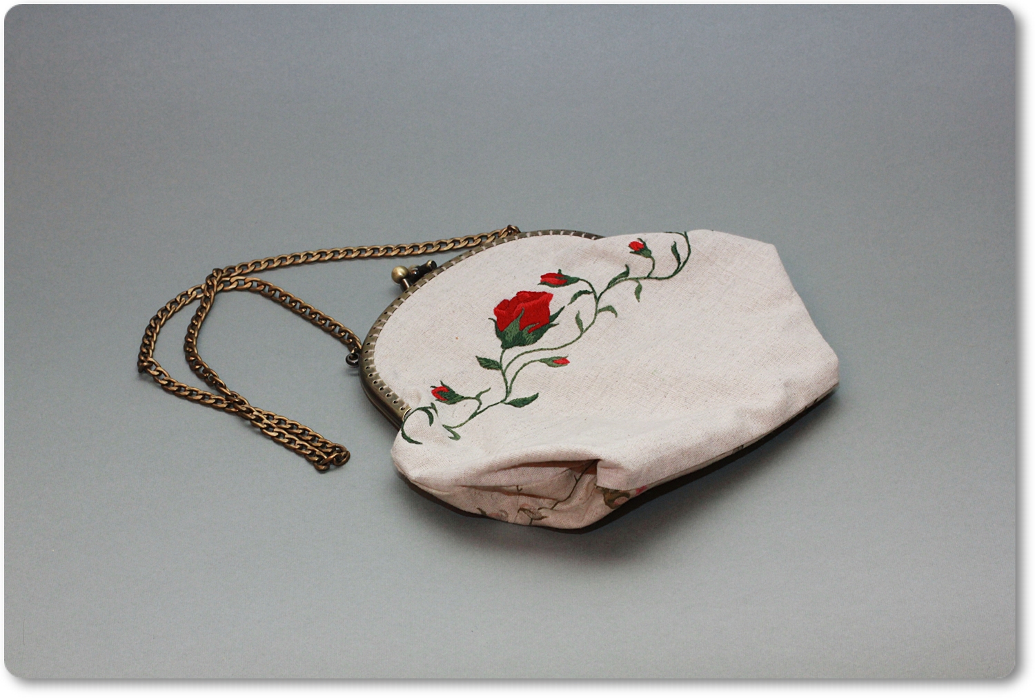 Материалы: Лён, нитки мулине, рамочный замок, ремешок-цепочка.
