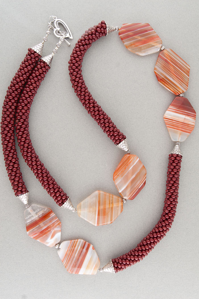Жгут из вишневого чешского бисера с сердоликом