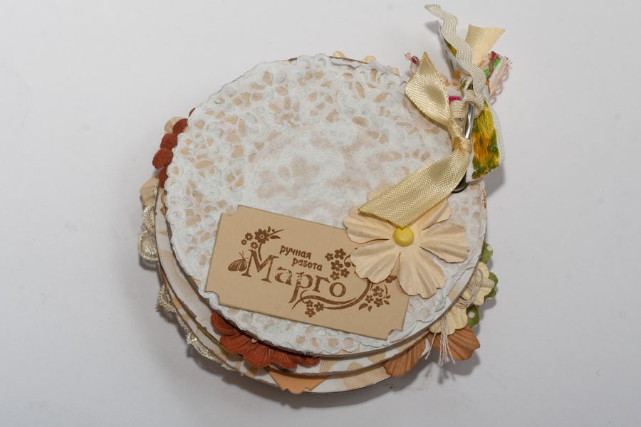 Материалы: салфетки ажурные, крафт-бумага, бумага для пастели, цветной картон, бумажные цветы, скелетированные листья, брадс, пуговицы, тесьма и кружево, люверсы.