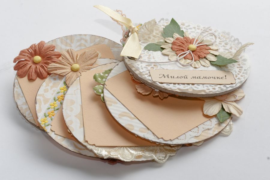Материалы: салфетки ажурные, крафт-бумага, бумага для пастели, цветной картон, бумажные цветы, скелетированные листья, брадс, пуговицы, тесьма и кружево, люверсы.