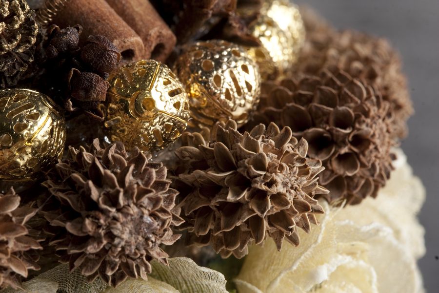 Материалы: ольховые шишки, корица, гвоздика, бусины, ленты.