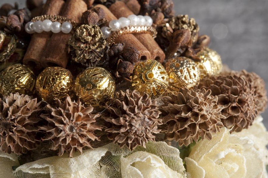Материалы: ольховые шишки, корица, гвоздика, бусины, ленты.