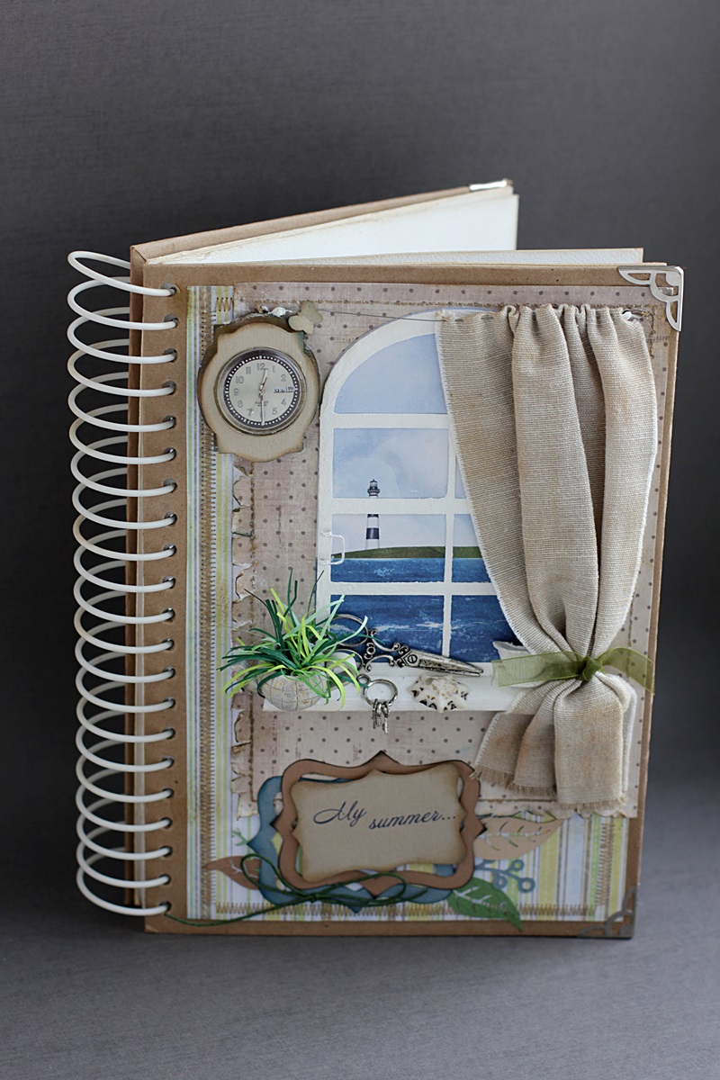 Материалы: Обложка - крафт-бумага, бумага для скрапбукинга, пастель, элементы из полимерной глины, металлические подвески, ткань, ленты, вощеный шнур, внутри плотные страницы для фотографий, страницы затонированы акрилом